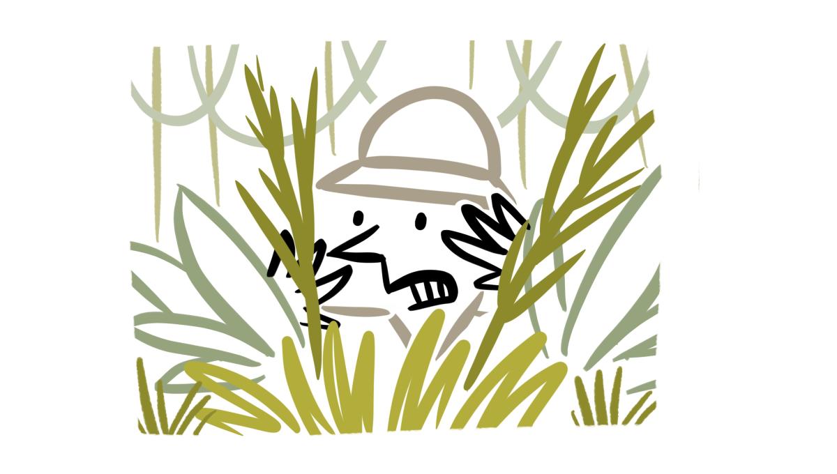 Drawing of an adventurer peering through grasses